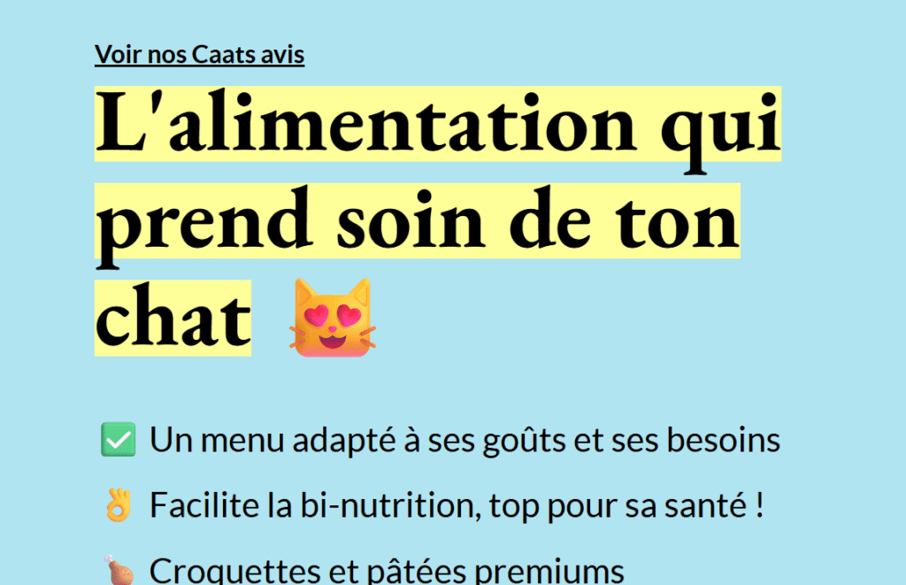 Caats sets itself apart in the pet food world by prioritizing customization over one-size-fits-all formulas, recognizing that every cat's age, weight, activity level, and health profile demands specific nutrition. Upon signing up at caats.co, owners answer a quick questionnaire about their feline friend, and an algorithm—backed by vets like Professor Nguyen and Dr. Denoun—generates a monthly menu of croquettes boasting over 41% animal proteins and pâtés rich in hydration-promoting moisture. These aren't just treats; they're scientifically balanced to mimic a cat's natural carnivorous diet, free from cereals, artificial additives, or fillers that plague mass-market options. French-made in controlled facilities in Vendée for kibble and Normandy for wet foods, each batch undergoes rigorous ISO 22000 testing for safety, traceability, and quality, ensuring your cat gets premium goodness without compromise. Owners report visible transformations within weeks: glossier fur, firmer stools, heightened playfulness, and even picky eaters devouring every bite. The subscription starts affordably around 20 euros monthly, with a 50% off trial kit to test the magic risk-free, and flexible pauses or cancellations via your account dashboard. Sustainability shines through recyclable packaging and a “one meal donated to a shelter cat per order” initiative, blending pet wellness with social good. Whether your cat battles weight issues, allergies, or simply deserves an upgrade, Caats adapts seamlessly—kitten formulas fuel growth spurts, adult blends sustain vitality, and senior recipes support joint health and kidney function. This isn't feeding; it's fueling a longer, happier life tailored just for them.